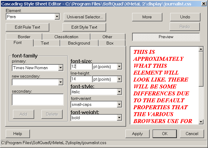 Samotný vzhled dokument při editaci je určen pomocí kaskádového stylu. Tento jazyk sice postrádá mnoho funkcí nabízených vyspělejšími jazyky jako XSL, ale na druhou stranu pro prezentaci na obrazovce zcela postačuje. Styl si můžete vytvořit vlastnoručně, nebo použít zabudovaný editor. Ten umožňuje nastavit pro jednotlivé elementy parametry zobrazení jako písmo, barvu, zarovnání apod. Ovládání je velice podobné nastavení stylu formátu odstavce tak, jak ho známe v klasických textových editorech.