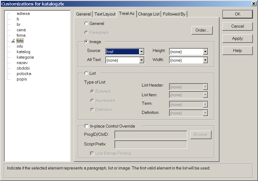 XMetaL nabízí mnoho možností, jak jej upravit. Tou nejzákladnější je možnost úprav chování a zpracování jednotlivých elementů z DTD. V poměrně rozsáhlém dialogovém okně (obrázek 9) můžeme pro každý element nastavit mnoho parametrů.